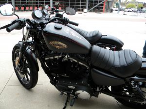 - Harley-Davidson Iron 883: Bare-knuckle minimalism and garage-built style featuring bullet design detailing, straight cut mufflers, a low drag-style handlebar, front fork gaiters, chopped rear fender and a solo tuck and roll seat. All new adjustable rear shocks and front cartridge forks provide stability and comfort. The Iron 883 is a nimble urban machine that kicks asphalt.