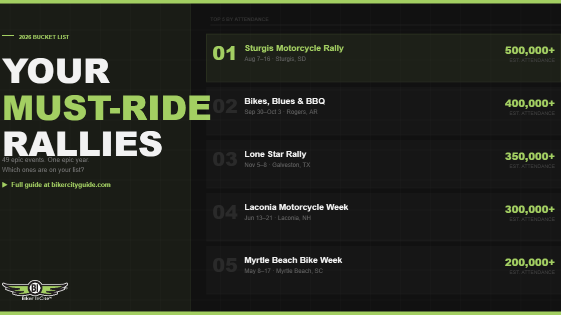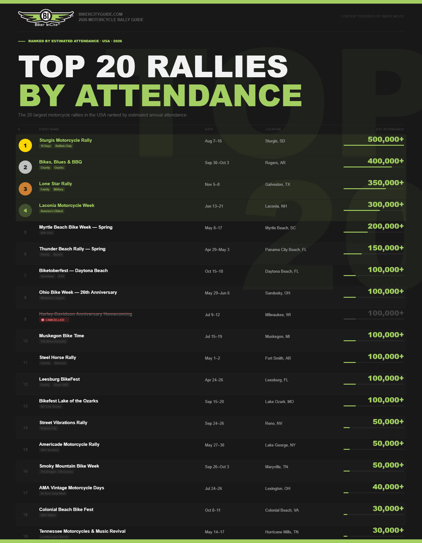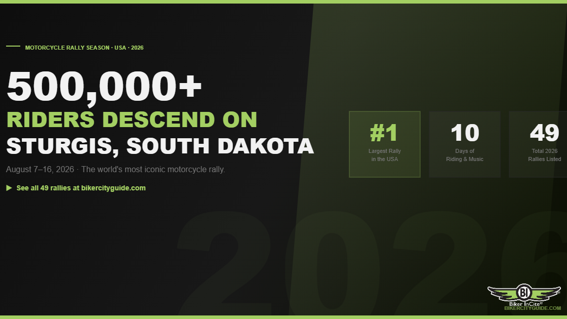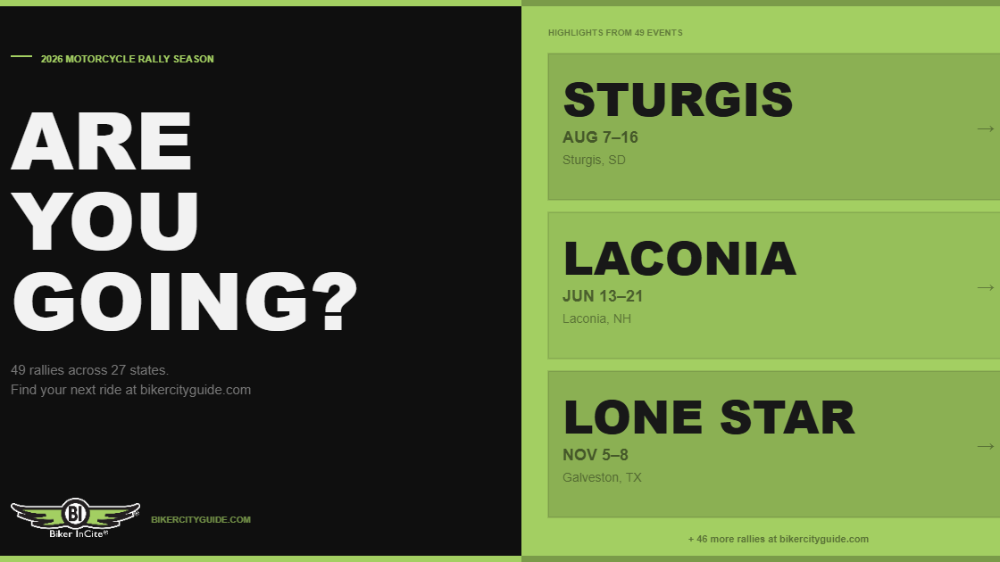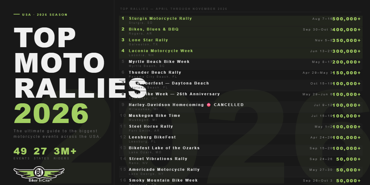 TOP MOTORCYCLE EVENTS APRIL 2026 to DECEMBER 2026 SEE 2026 LISTINGSEE 2026 LISTING BY ATTENDANCE So many rallies, so many trips, so many choices to make. Click to choose. So many rallies, so many trips, so many choices to make. Click to choose.